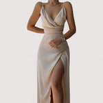 Ob Sommerhochzeit, Dachterrassenparty oder romantisches Dinner – mit diesem Kleid sind Sie immer perfekt gekleidet. Der sanfte Glanz und der fliessende Schnitt kreieren einen femininen, mühelosen Look. Der hohe Schlitz fügt einen Hauch von Drama und Eleganz hinzu.
