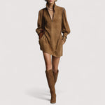 Leira™ | Smeđa opuštena mini haljina od brušene kože s patentnim zatvaračem i dolčevita ovratnikom