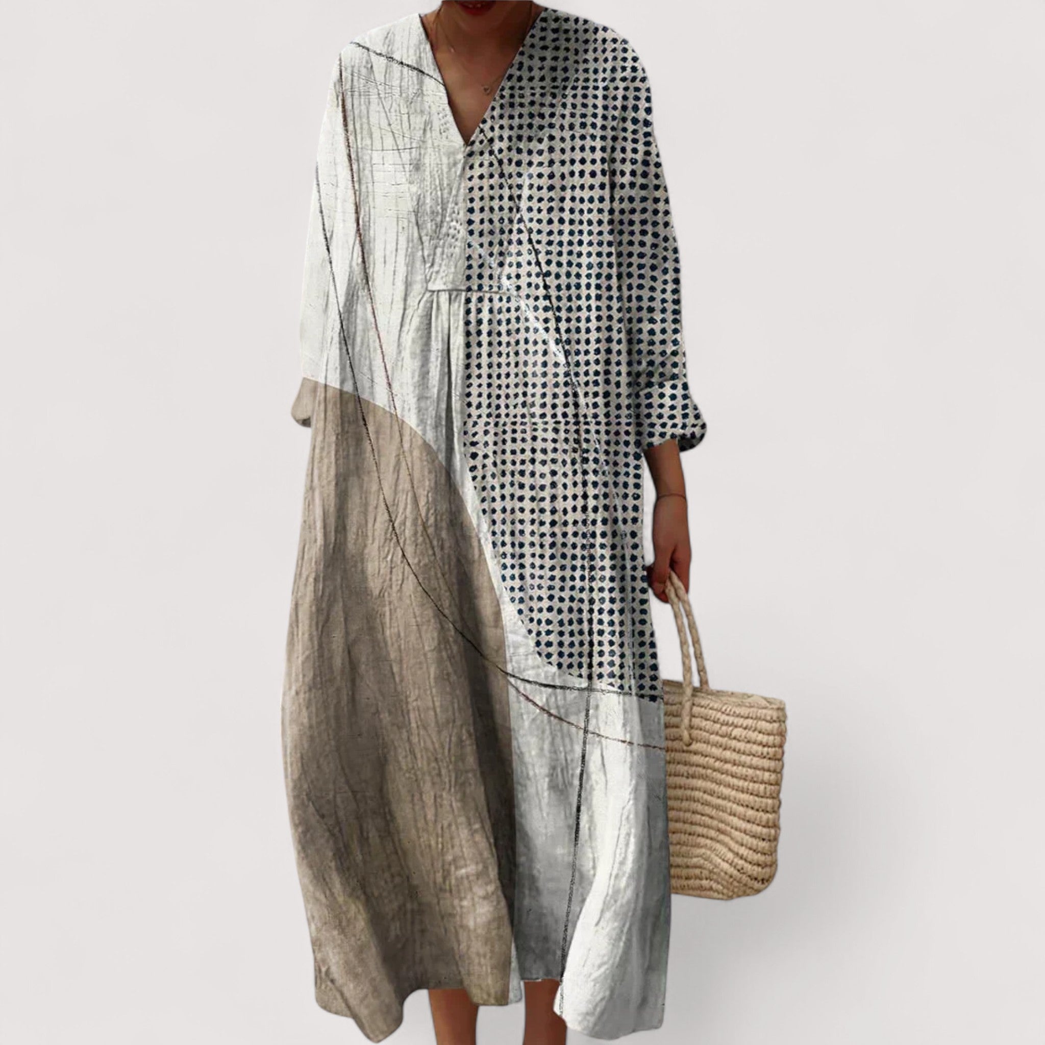 Umarmen Sie die entspannte Eleganz dieses Kleides mit fliessendem Schnitt und künstlerischem Muster. Es betont Ihre natürliche Schönheit, bietet mühelosen Komfort und Stil – ein essentielles Stück für einen kreativen Alltag.