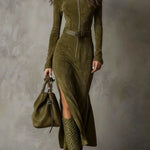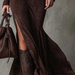 Ova luksuzna maksi haljina od meke tkanine brušene kože spaja retro šarm sa strukiranom siluetom i visokim prorezom. Naglasite svoju figuru i uživajte u cjelogodišnjem stilu bez napora.