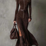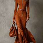Neris™ | Vintage Smeđa maksi haljina s patentnim zatvaračem i remenom