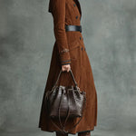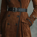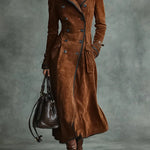 Ovaj luksuzni dugački kaput od meke brušene kože obavija vas profinjenošću i naglašenom, laskavom siluetom. Nezaobilazan je ključni komad s klasičnim detaljima za vaš ormar.