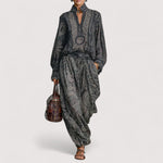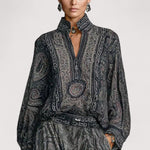 Ovaj luksuzni dvodijelni komplet spaja klasični Paisley print sa sofisticiranim stojećim ovratnikom i nudi eleganciju bez napora. Opušteni kroj jamči cjelodnevnu udobnost i savršeno usklađen izgled.