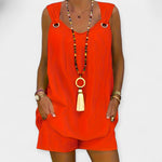 Savršeni ljetni chic outfit koji kombinira svježinu i eleganciju. Majica bez rukava s V izrezom ističe dekolte na diskretan način, dok kratke hlače nude udobno pristajanje i ženstveni kroj. Moderni set za svaku priliku tijekom dana.