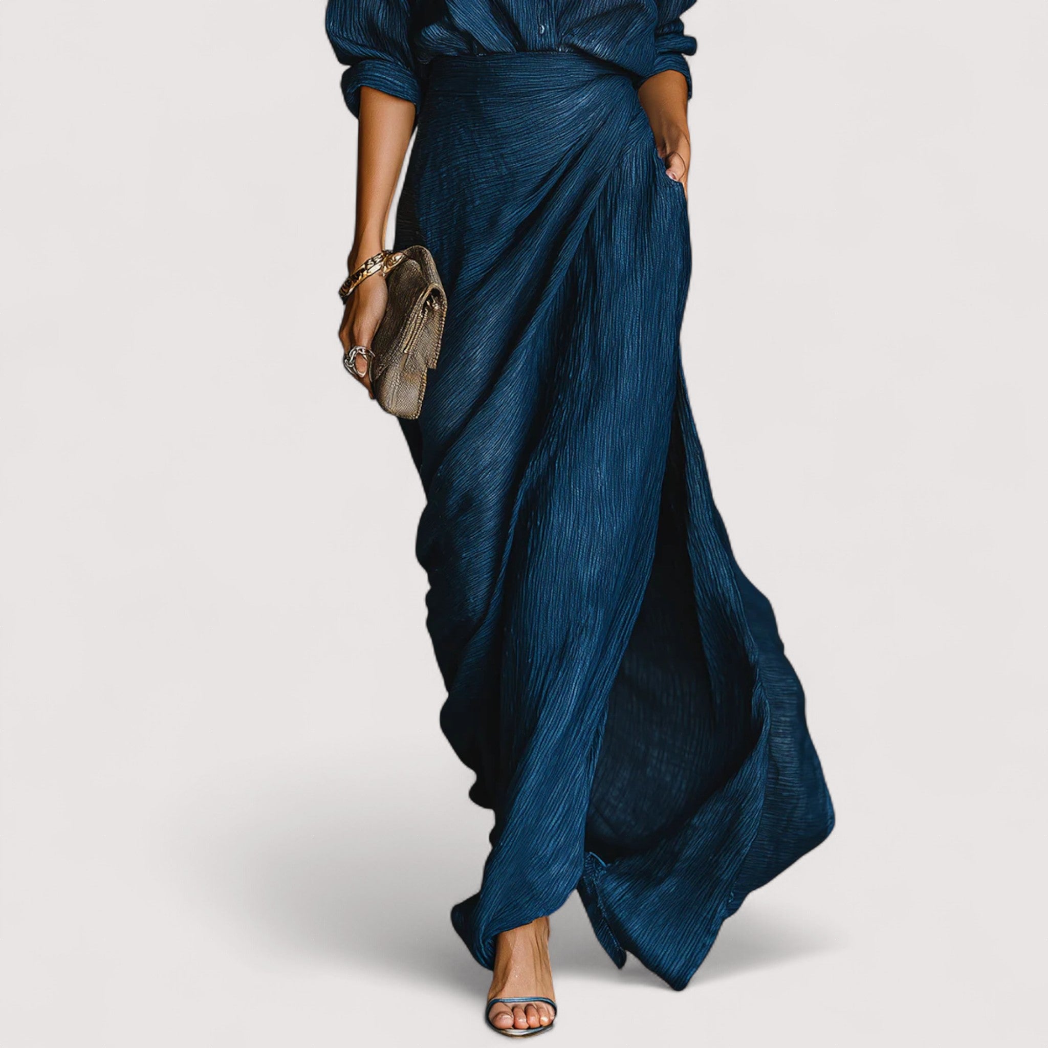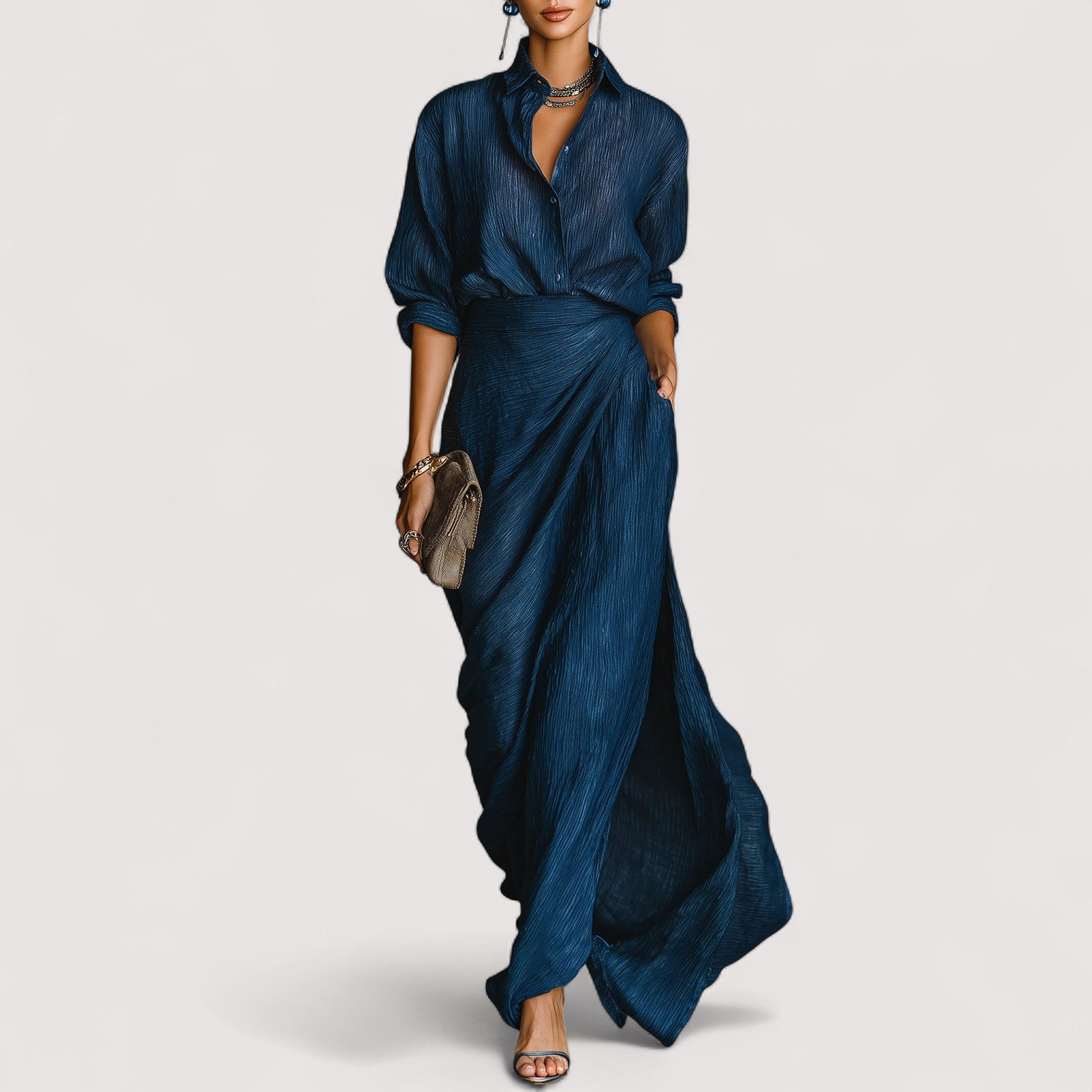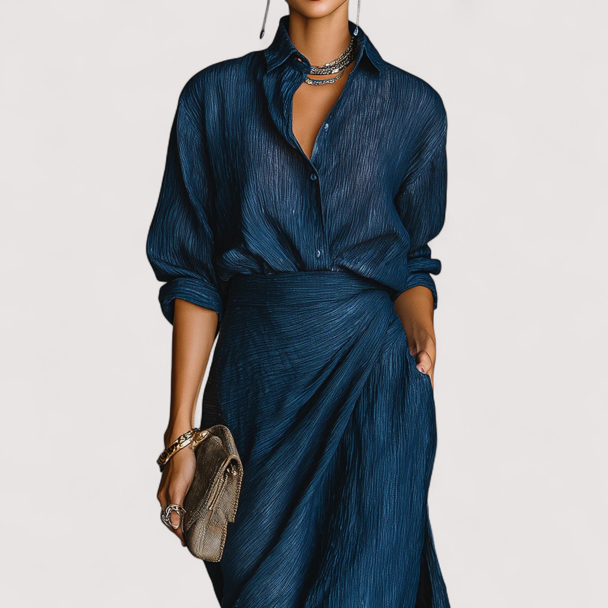 Lenora™ | Elegantni set tamnoplave boje od košulje i duge suknje, mješavina pamuka i lana