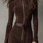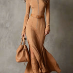 Neris™ | Vintage Smeđa maksi haljina s patentnim zatvaračem i remenom